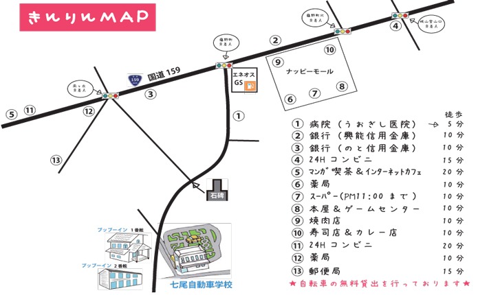 - JR七尾駅…学校からスクールバス8分、自転車20分
